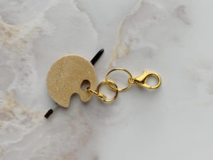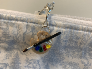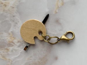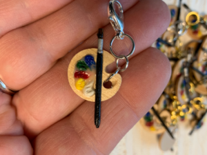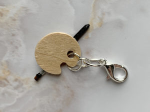 Handmade realistic artist palette miniature polymer clay and wood charm for knitting or crocheting as a progress keeper and stitch marker.