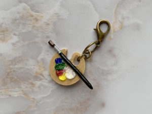 Both the palette and brush are hand-carved from real wood and the “oil paints” are sculpted from polymer clay. Every charm is unique and sealed with a non-toxic Varathane Diamond Finish for durability. Choose your findings preference from antiqued brass tone, gold plated rings with gold tone lobster clasp or silver plated rings with silver plated lobster clasp (please select).