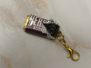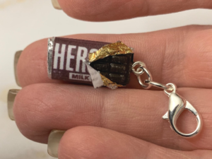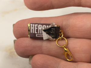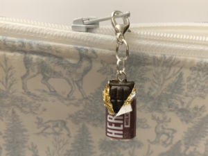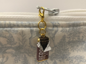 Handmade realistic miniature chocolate bar polymer clay charm for knitting or crocheting as a progress keeper and stitch marker.