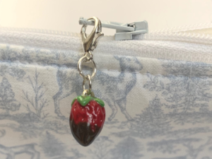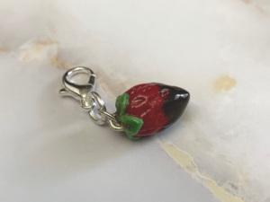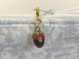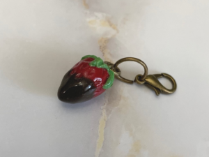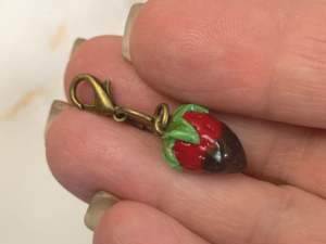Handmade realistic miniature chocolate dipped strawberry polymer clay charm for knitting or crocheting as a progress keeper and stitch marker.