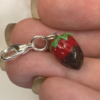 Handmade realistic miniature chocolate dipped strawberry polymer clay charm for knitting or crocheting as a progress keeper and stitch marker.