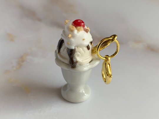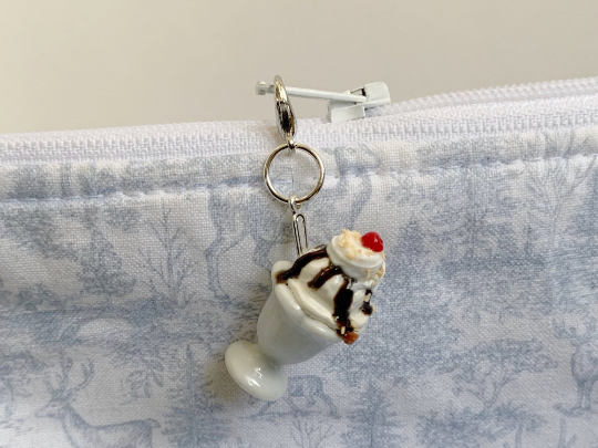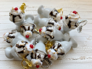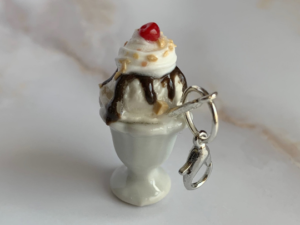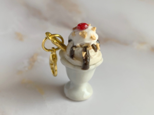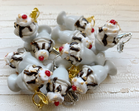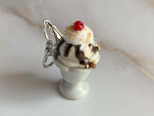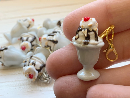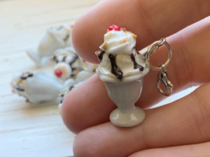Handmade realistic miniature ice cream sundae polymer clay charm for knitting or crocheting as a progress keeper and stitch marker.