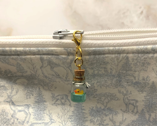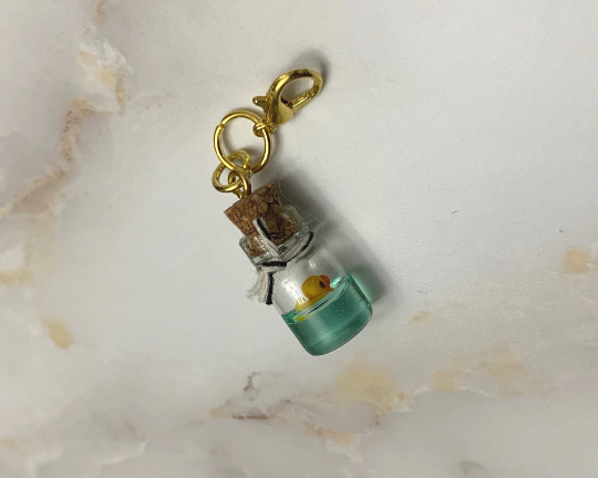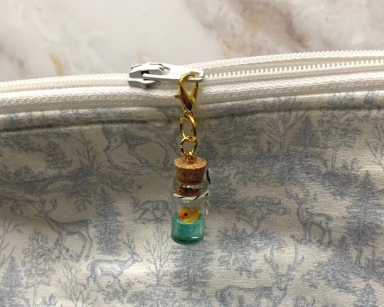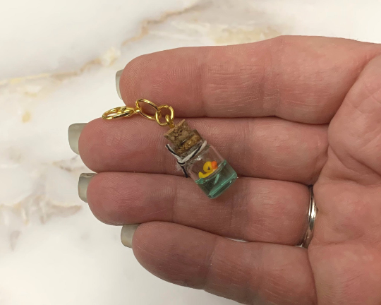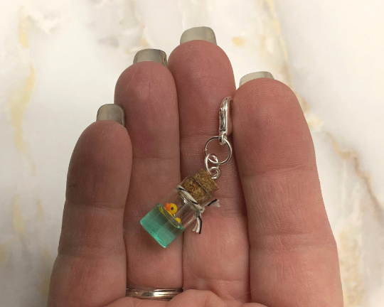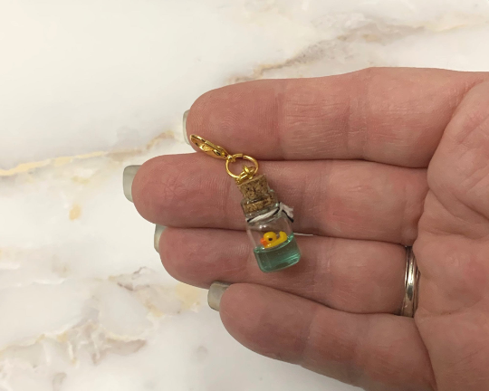 Hand-made rubber duck in a bottle miniature polymer clay charm for knitting or crocheting as a progress keeper and stitch marker.