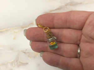 The corks of these bottles are sealed with clear epoxy and a bit of black and white twine is knotted around the neck of the bottle. You have your choice of three finding colours: antiqued brass rings and lobster clasp, gold plated rings and gold tone lobster clasp or silver plated rings and silver plated lobster clasp (please select).