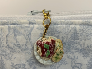 Hungry for a spicy Italian meal? Maybe this plate of spaghetti, topped with tomato sauce, Parmesan cheese and basil will satisfy – and make sure you don’t forget the garlic toast – with a sprinkling of Parmesan and parsley too! This original progress keeper will look great on your knitting / crocheted projects, hanging from your project bag, zipper pull or anywhere you like. Makes a great gift or a special treat for yourself!