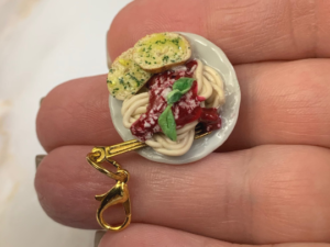 Handmade realistic miniature plate of spaghetti polymer clay charm for knitting or crocheting as a progress keeper and stitch marker.