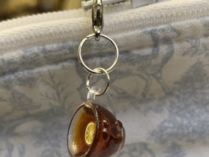 Handmade realistic cup of tea miniature epoxy resin charm for knitting or crocheting as a progress keeper and stitch marker.