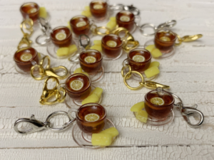 Handmade realistic cup of tea miniature epoxy resin charm for knitting or crocheting as a progress keeper and stitch marker.