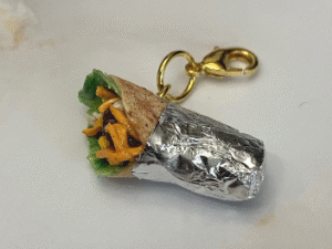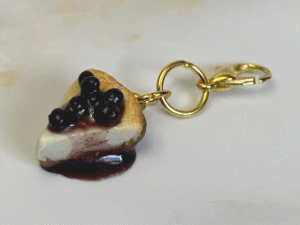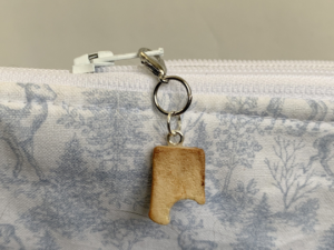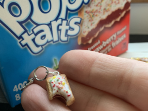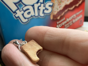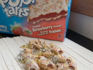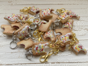 Handmade realistic miniature toaster pastry polymer clay charm for knitting or crocheting as a progress keeper and stitch marker.
